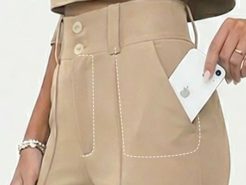 Featuring a chic high-waist silhouette with a unique double-button closure that adds a touch of sophistication while providing a tailored fit, perfect for a stylish and confident appearance.