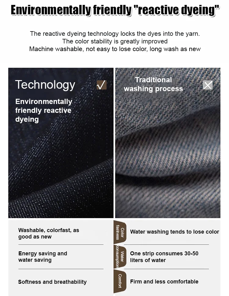 Denim softens with every wash, unlike traditional jeans that stiffen over time.